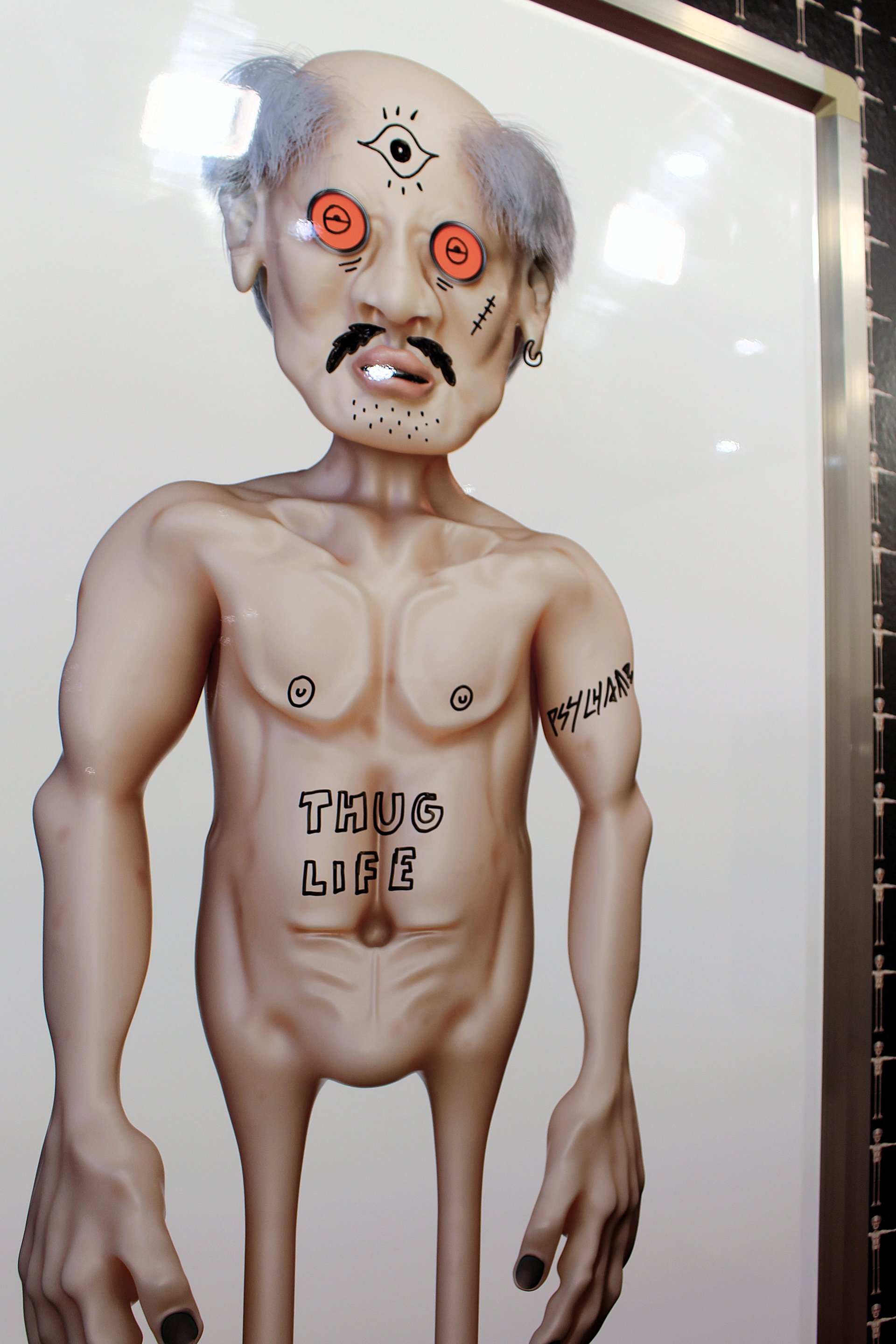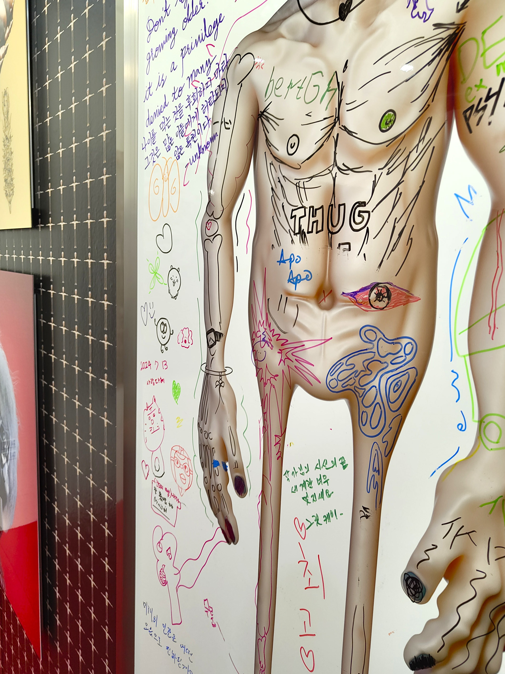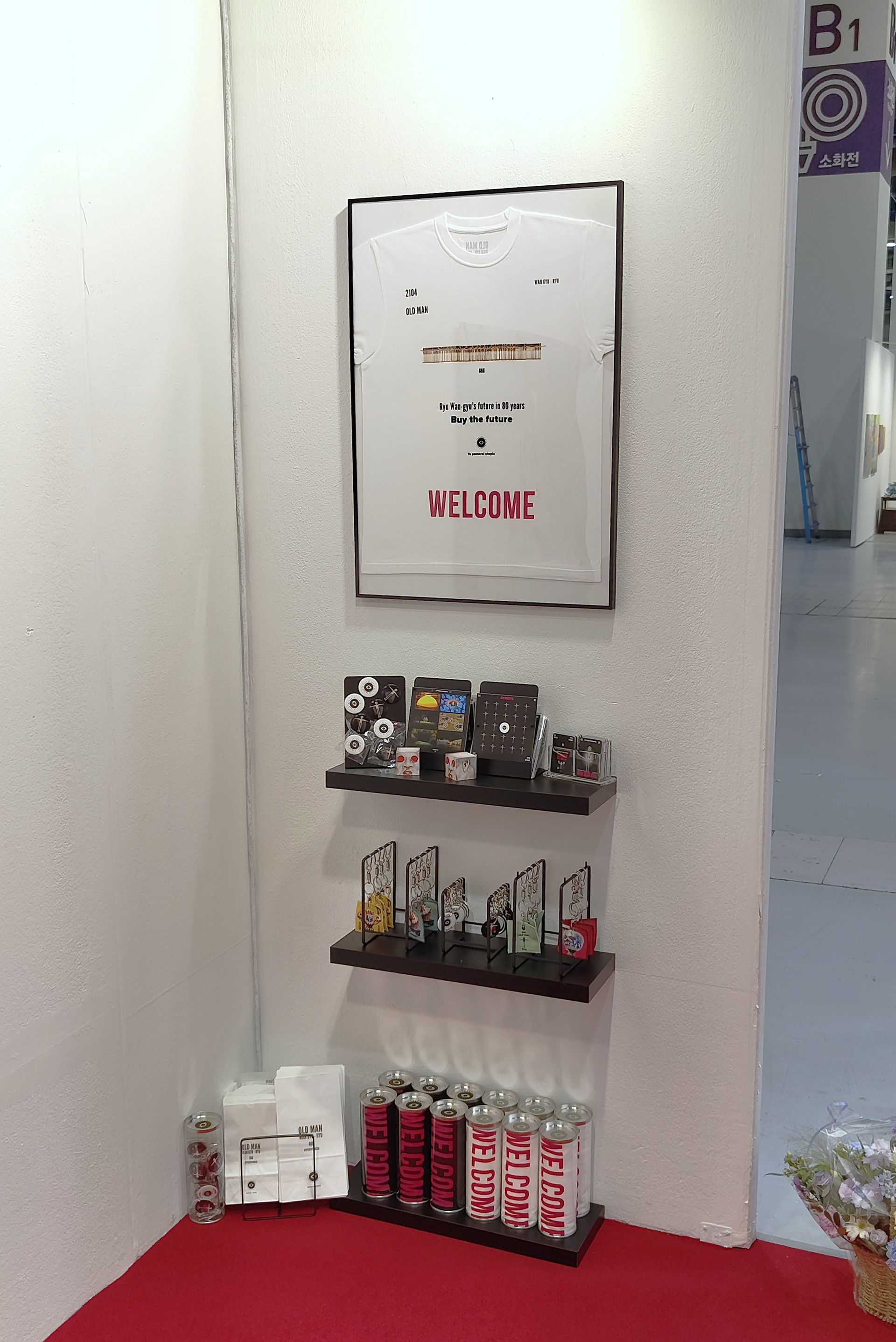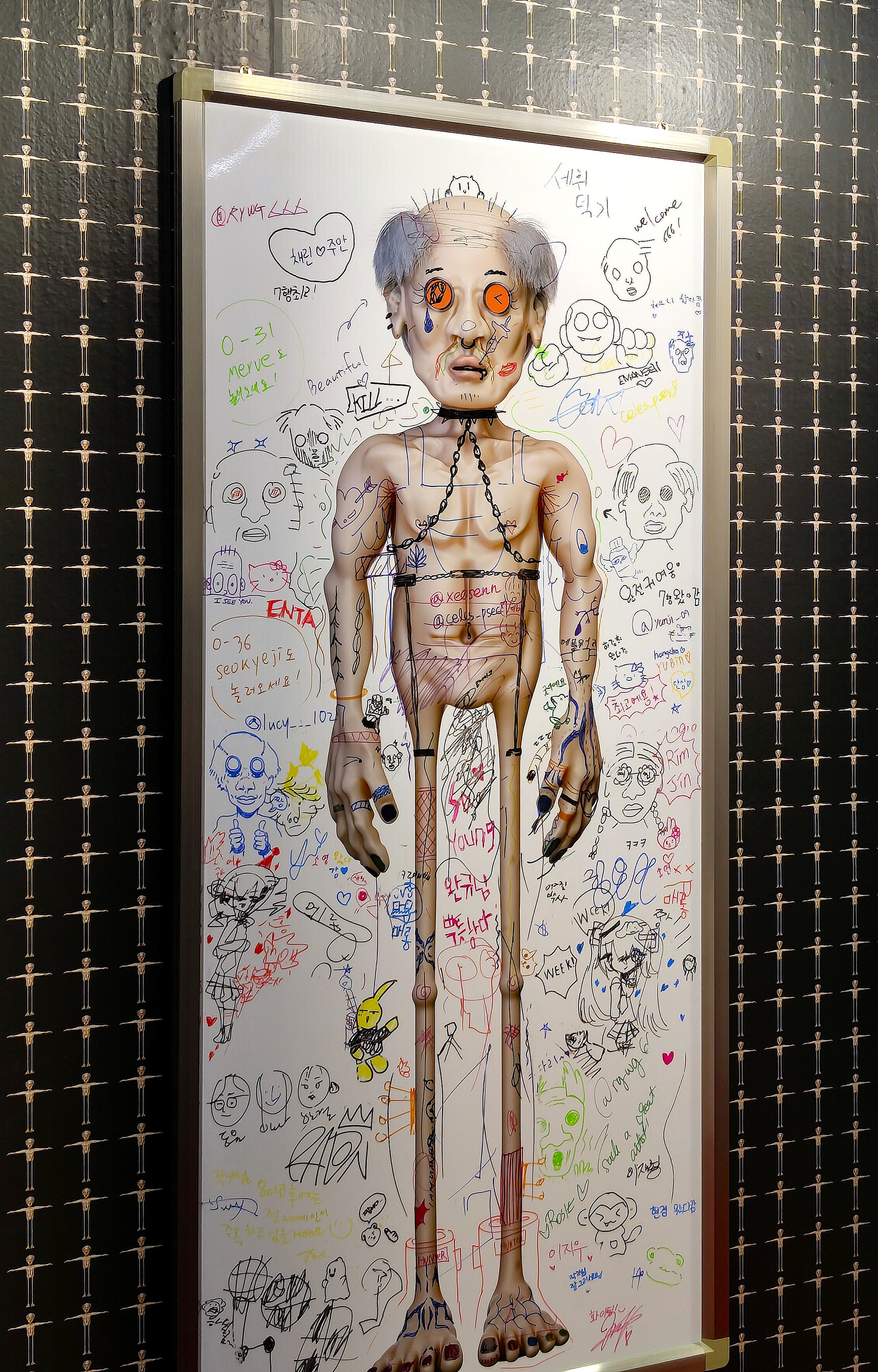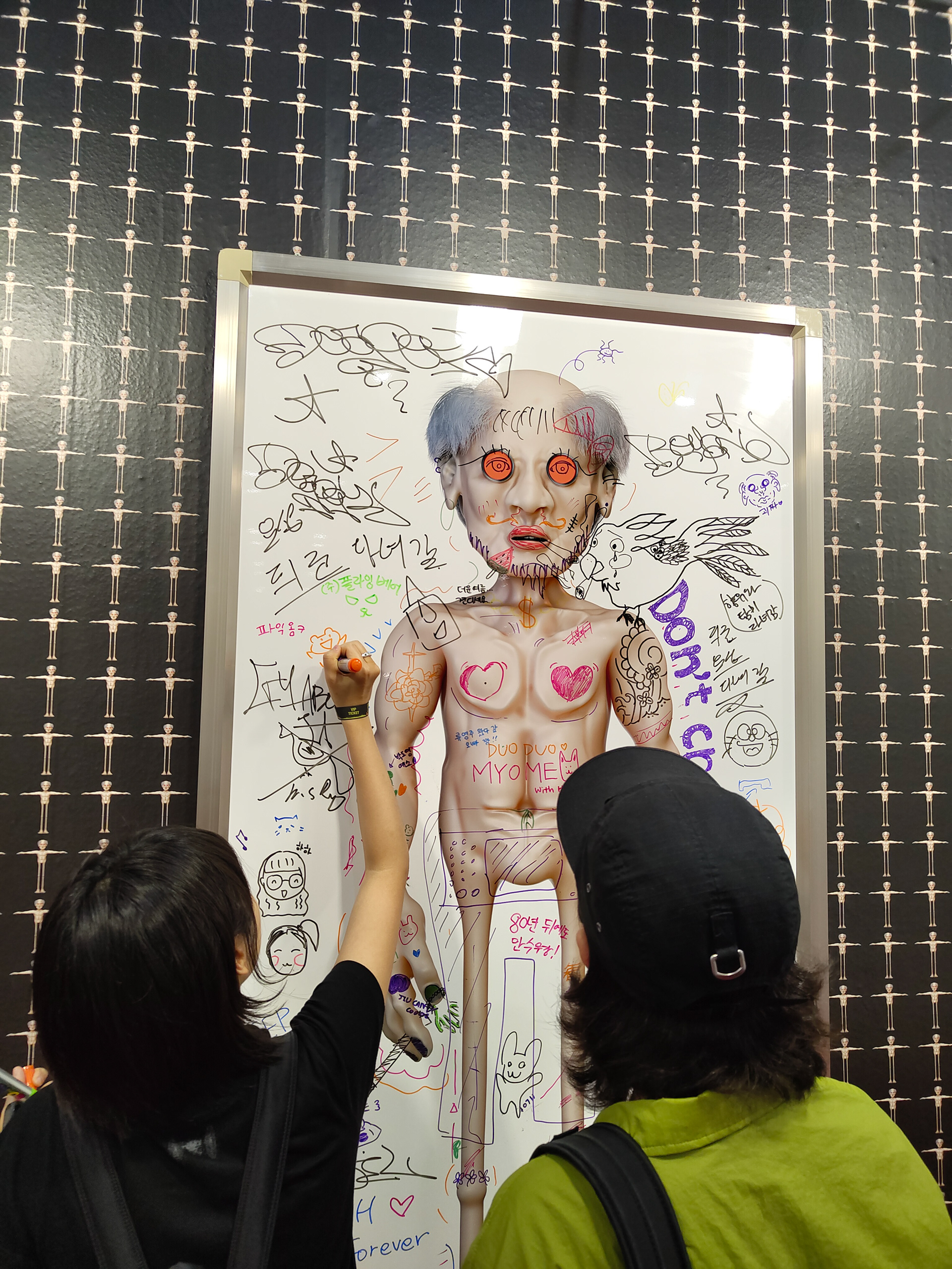 대형 화이트보드 위에 인쇄된 OLDman의 이미지는 관객의 개입을 기다리는 열린 캔버스로 존재한다.
