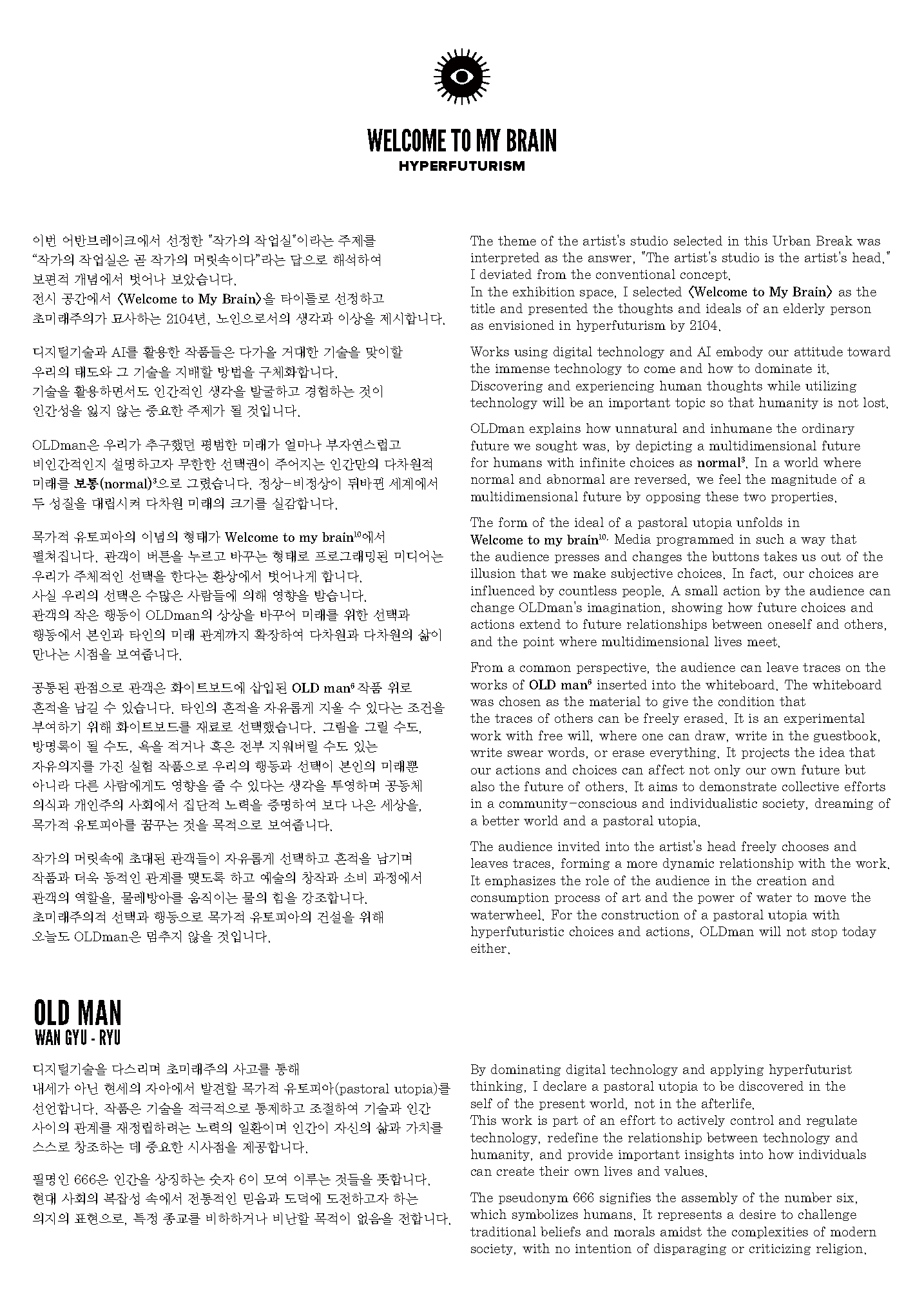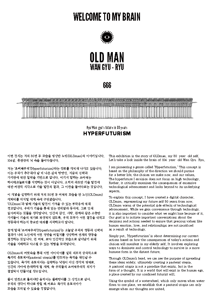 작가는 자신의 80년 후 자아인 ‘OLDman’을 디지털 캐릭터로 구현하고, 관객이 그의 뇌 속을 탐험하는 구조로 전시를 구성했다.